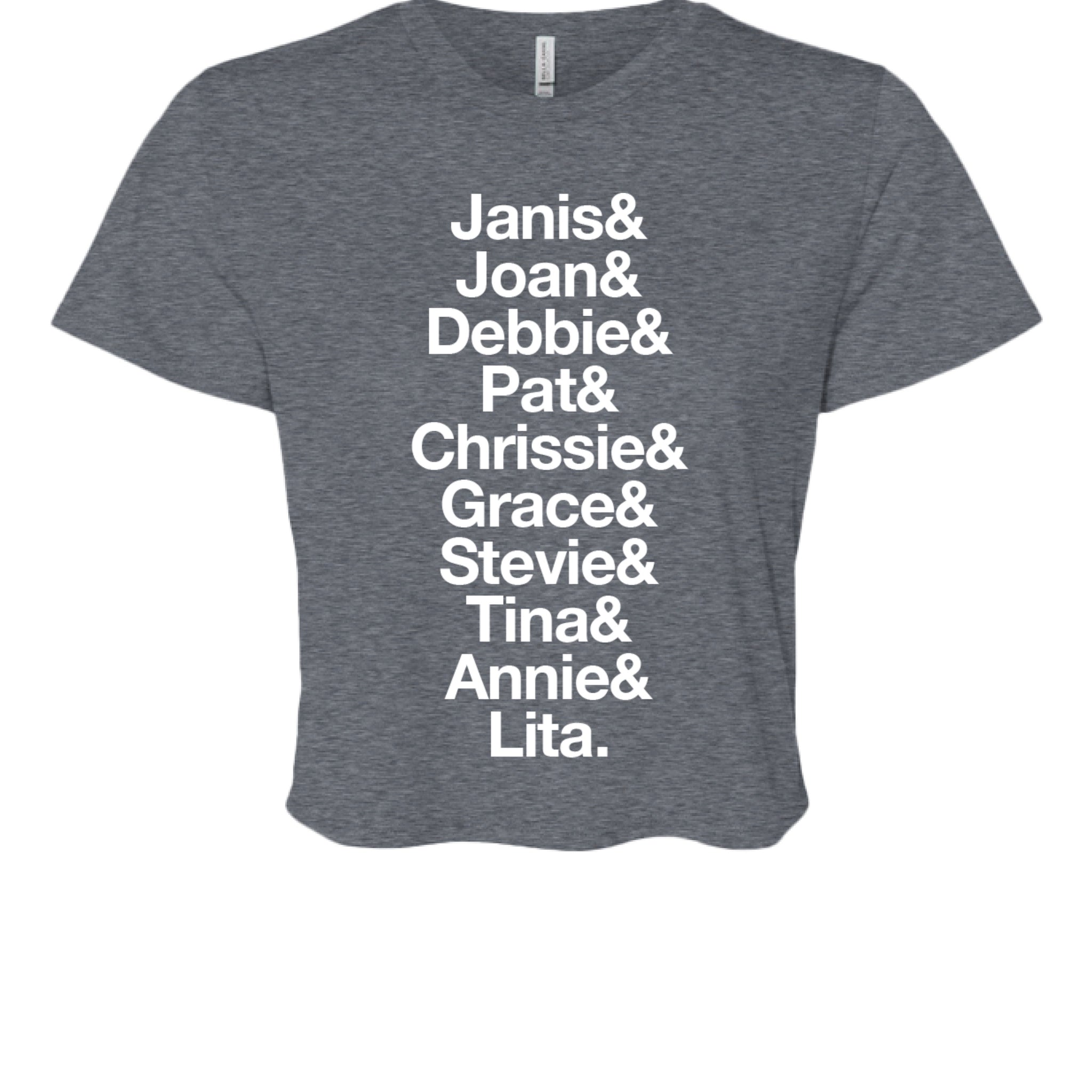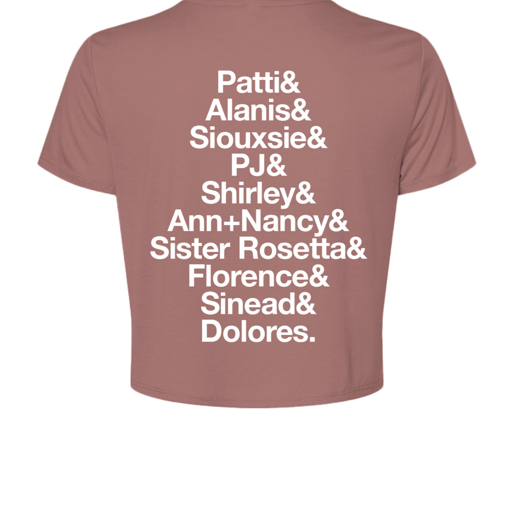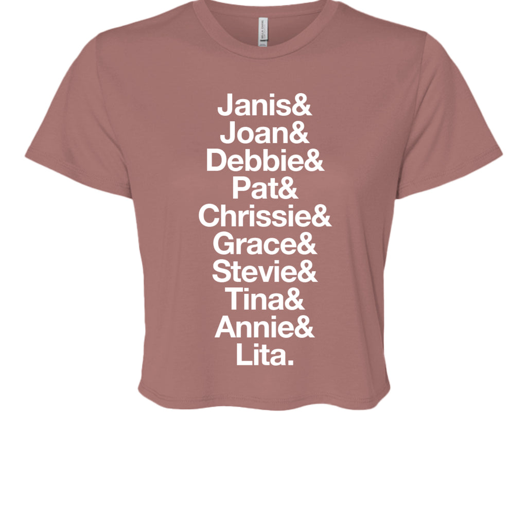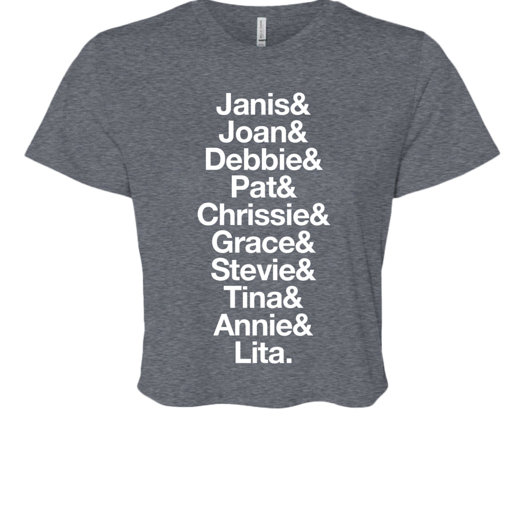 Based on Gina's Telluride Yoga Festival tribute class, this Ladies' Flowy Cropped T-Shirt has the name of some of the female icons in rock music!