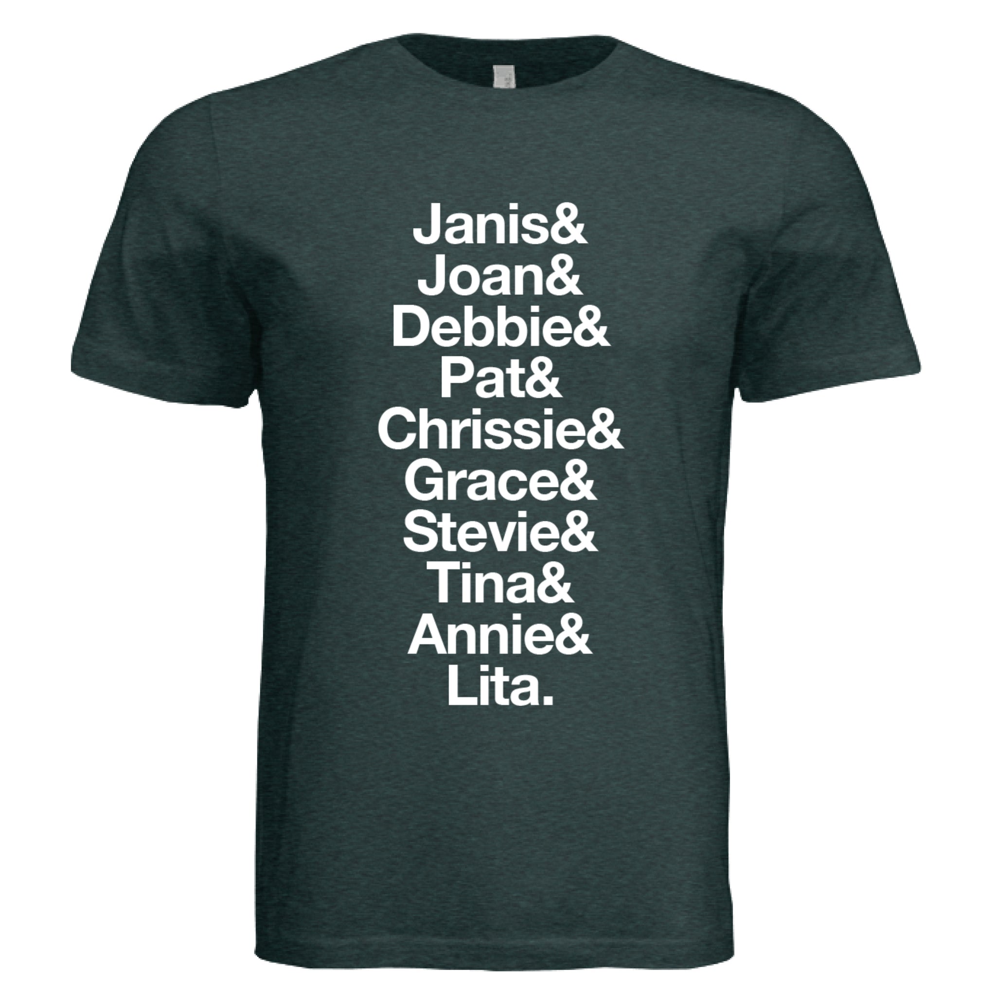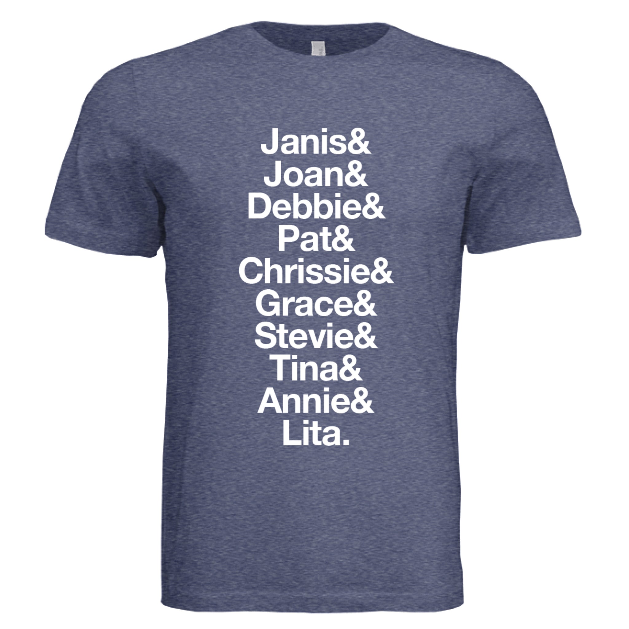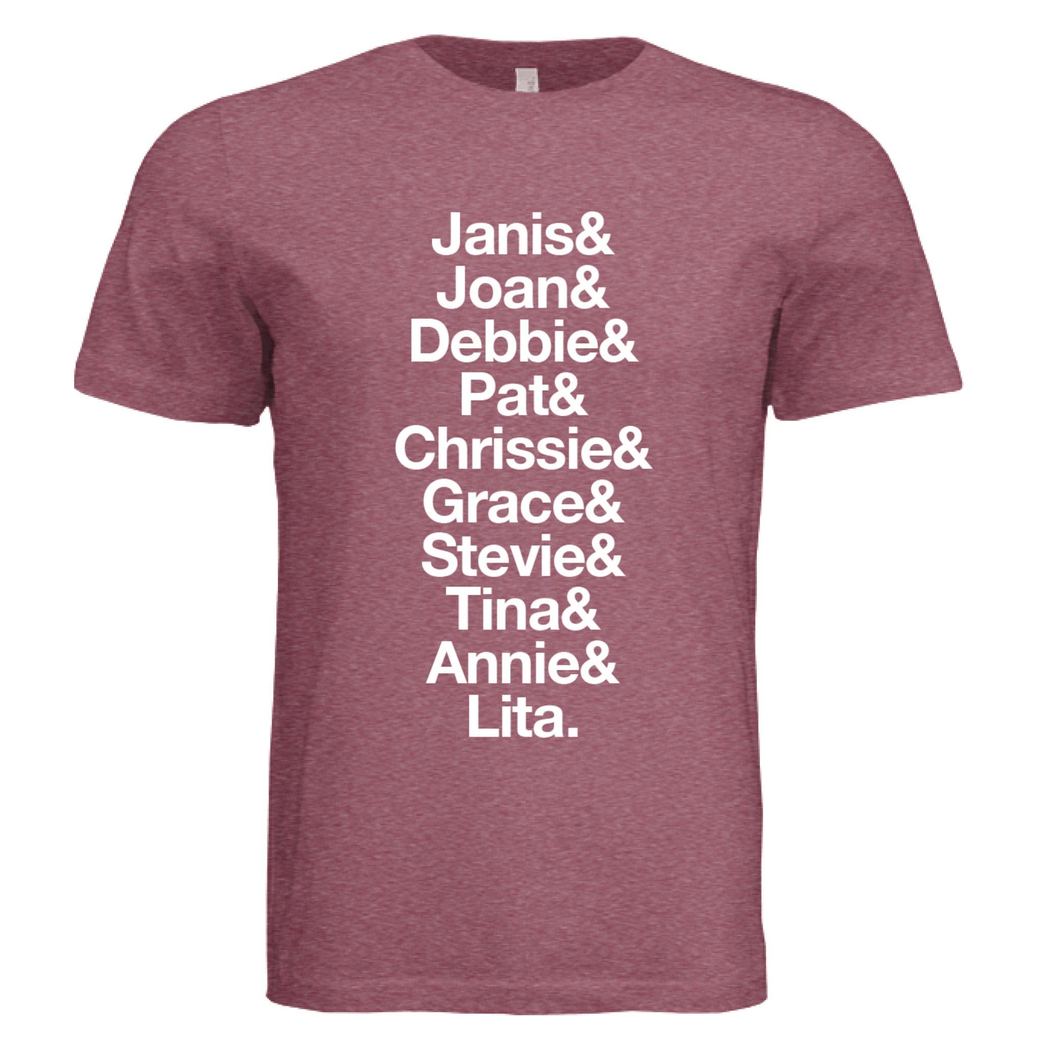 Based on Gina's iconic tribute class, this Unisex Triblend Short-Sleeve T-Shirt has the name of some of the female icons in rock music!